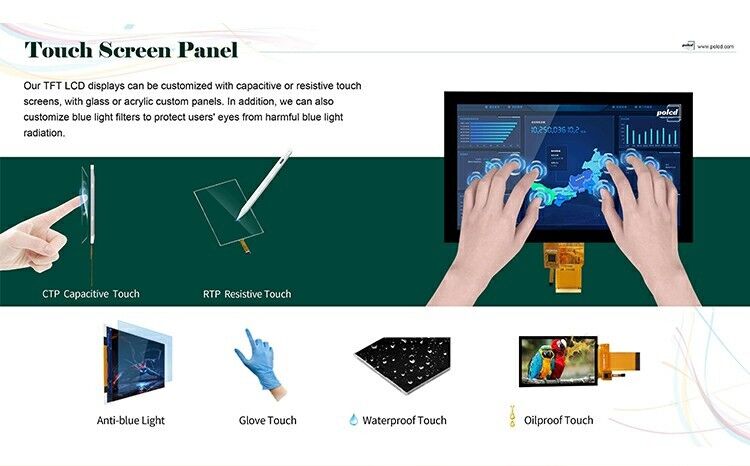 R: Podemos ofrecerle RTP (Panel táctil resistivo) y CTP (Panel táctil capacitivo) si lo necesita.
